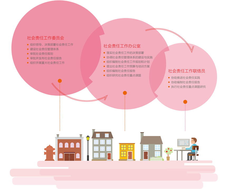CMEC成立以董事長為主任、總裁為執(zhí)行主任、各職能部門和事業(yè)部總經(jīng)理為委員的社會(huì)責(zé)任工作委員會(huì),負(fù)責(zé)統(tǒng)籌、規(guī)劃和協(xié)調(diào)公司全面社會(huì)責(zé)任工作;委員會(huì)下設(shè)社會(huì)責(zé)任工作辦公室,設(shè)在戰(zhàn)略與經(jīng)營發(fā)展部,負(fù)責(zé)委員會(huì)的決策落實(shí)和日常工作;各職能部門和事業(yè)部建立社會(huì)責(zé)任工作聯(lián)絡(luò)員,負(fù)責(zé)實(shí)施和完成本部門或單位企業(yè)社會(huì)責(zé)任管理的相關(guān)工作。