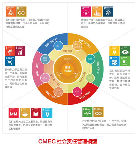 CMEC致力推動(dòng)聯(lián)合國可持續(xù)發(fā)展目標(biāo)(SDGs)的實(shí)現(xiàn),以正確的義利觀為核心,結(jié)合行業(yè)特色、自身優(yōu)勢和責(zé)任實(shí)踐,攜手股東與投資者、員工、政府、客戶、行業(yè)、合作伙伴等利益相關(guān)方,追求經(jīng)濟(jì)社會(huì)環(huán)境綜合價(jià)值最大化,培養(yǎng)責(zé)任文化,健全社會(huì)責(zé)任工作體系,加強(qiáng)責(zé)任溝通,為經(jīng)濟(jì)、社會(huì)、環(huán)境等可持續(xù)發(fā)展問題提供創(chuàng)新性的解決途徑,努力實(shí)現(xiàn)與各利益相關(guān)方共同發(fā)展、和諧共贏,助力國家、世界實(shí)現(xiàn)可持續(xù)發(fā)展。